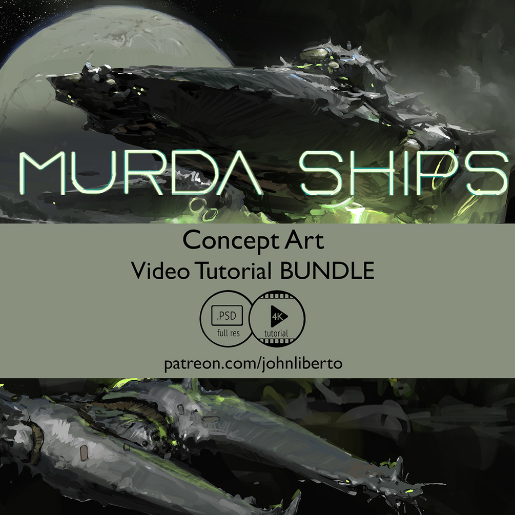 I go through the process and useful advice for designing space ships in Photoshop, one is the process of working from a side view and then painting the design in perspective. The other is more of a speed painting like tutorial showing idea making on the fly.